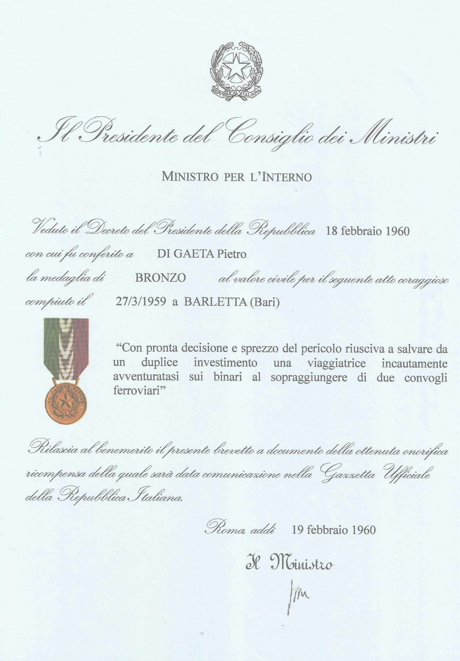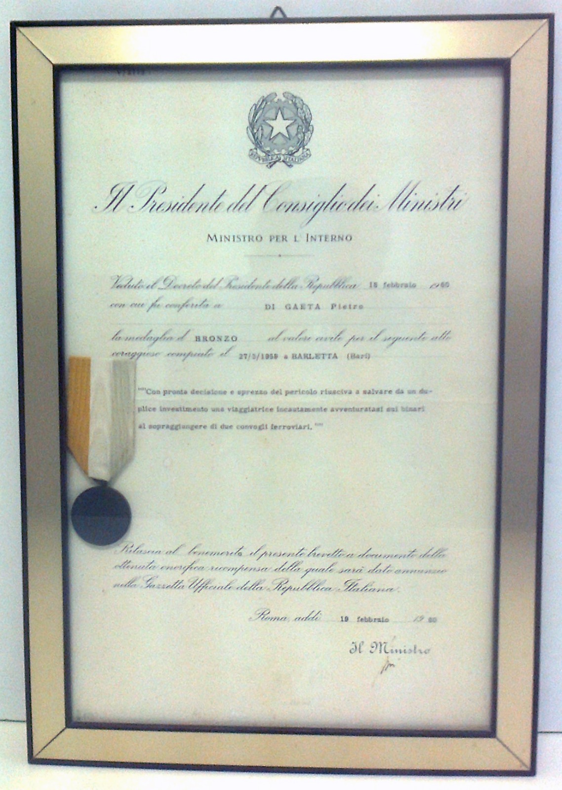 MEDAGLIA DI BRONZO al VALORE CIVILE per il seguente alto coraggio compiuto il 27/3/1959