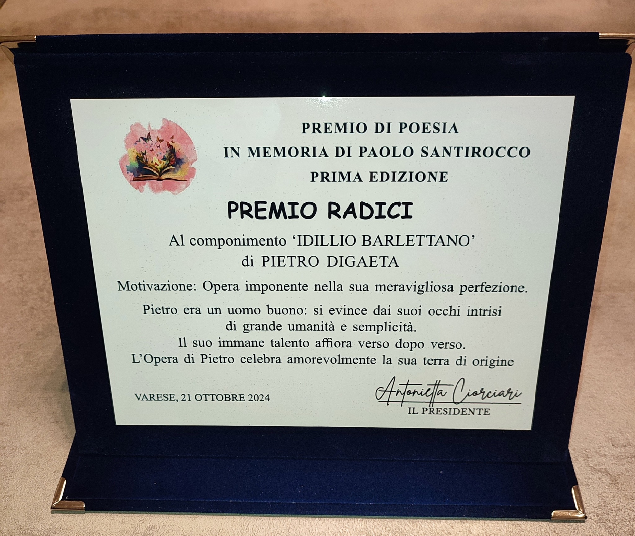 Il 14 ottobre 2023, sempre con la poesia “IDILLIO BARLETTANO”dove gli fu consegnato un “Diploma d’Onore-Menzione”